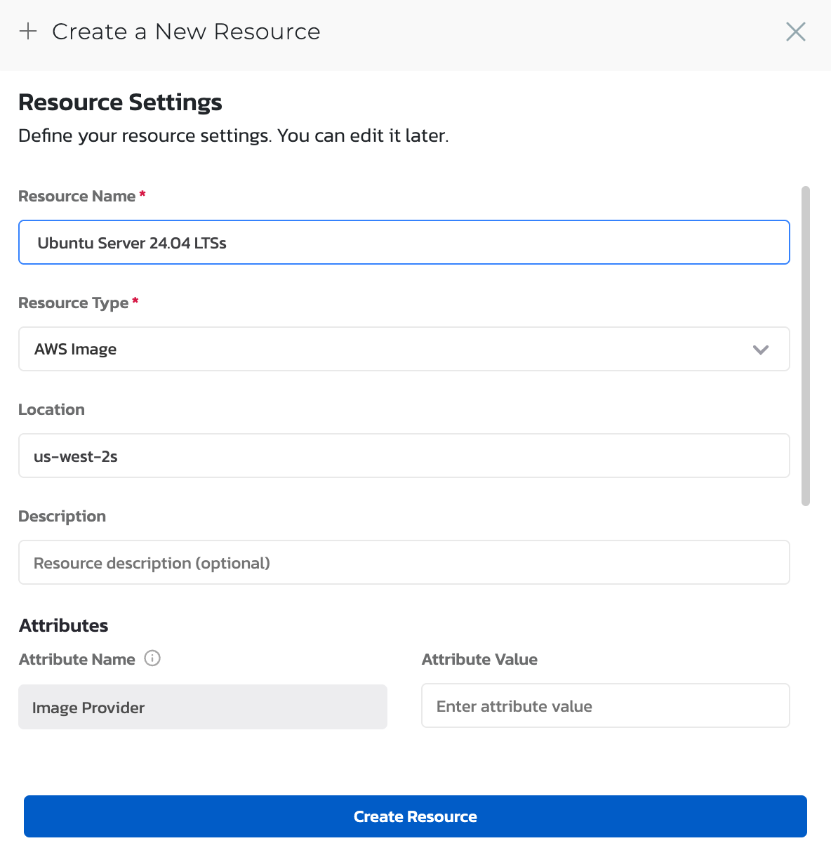 Attribute Values: Provide values for all required attributes defined in the resource type.